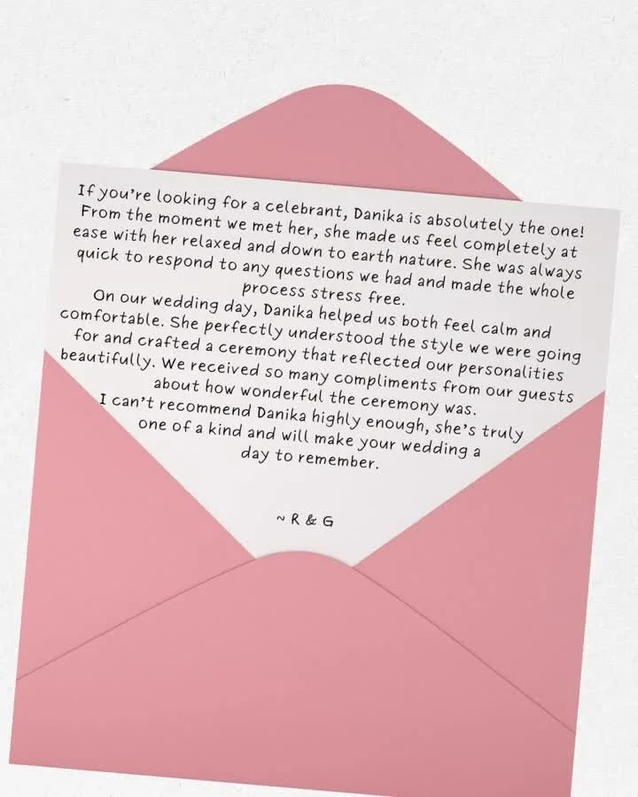 “Cant recommend Danika enough! Our ceremony was fun and relaxed, just as we hoped for. From initial enquiry, Danika communicated every step so clearly and made us feel completely at ease. She took all our thoughts into consideration and designed our perfect ceremony. Thank you so much! For any brides looking for the perfect celebrant, look no further than Danika”
